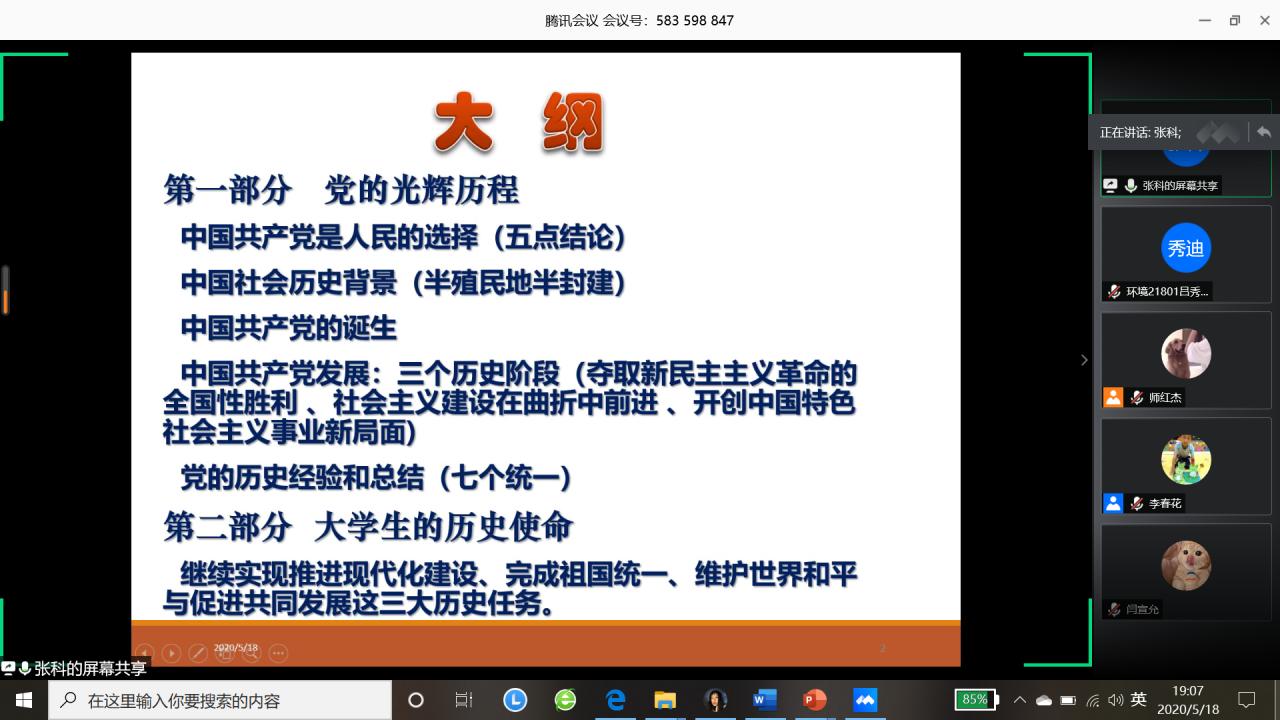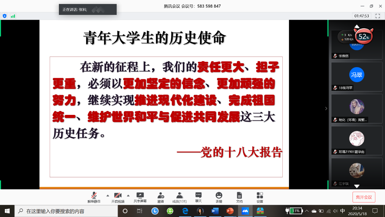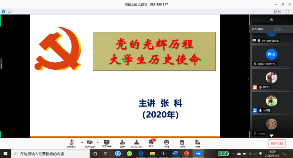 (图/文:吕秀迪)为进一步做好公司党员发展工作,加强对发展对象和入党积极分子的教育和培养,引导其提高思想觉悟,保证发展新党员的质量。304am永利集团于2020年5月18日晚19:00以线上腾讯会议的形式举行了2020年上半年入党积极分子和党员发展对象培训会议。公司党委书记张科主讲,党委副书记范梅英参加、本科员工工作党支部书记李春花主持,共130余名入党积极分子和党员发展对象线上学习。