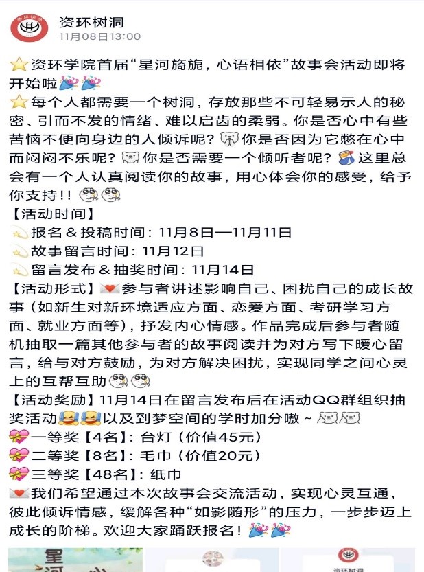 (通讯员 张昊冉 图/文)为增加同学之间的互动交流,改善和调节学习和生活中的不良情绪,304am永利集团团委员工会心育部在线上举行了304am永利集团首届“星河旖旎,心语相依”故事会活动。活动时间为2021年11月8日至2021年11月14日,活动对象为304am永利集团全体员工。