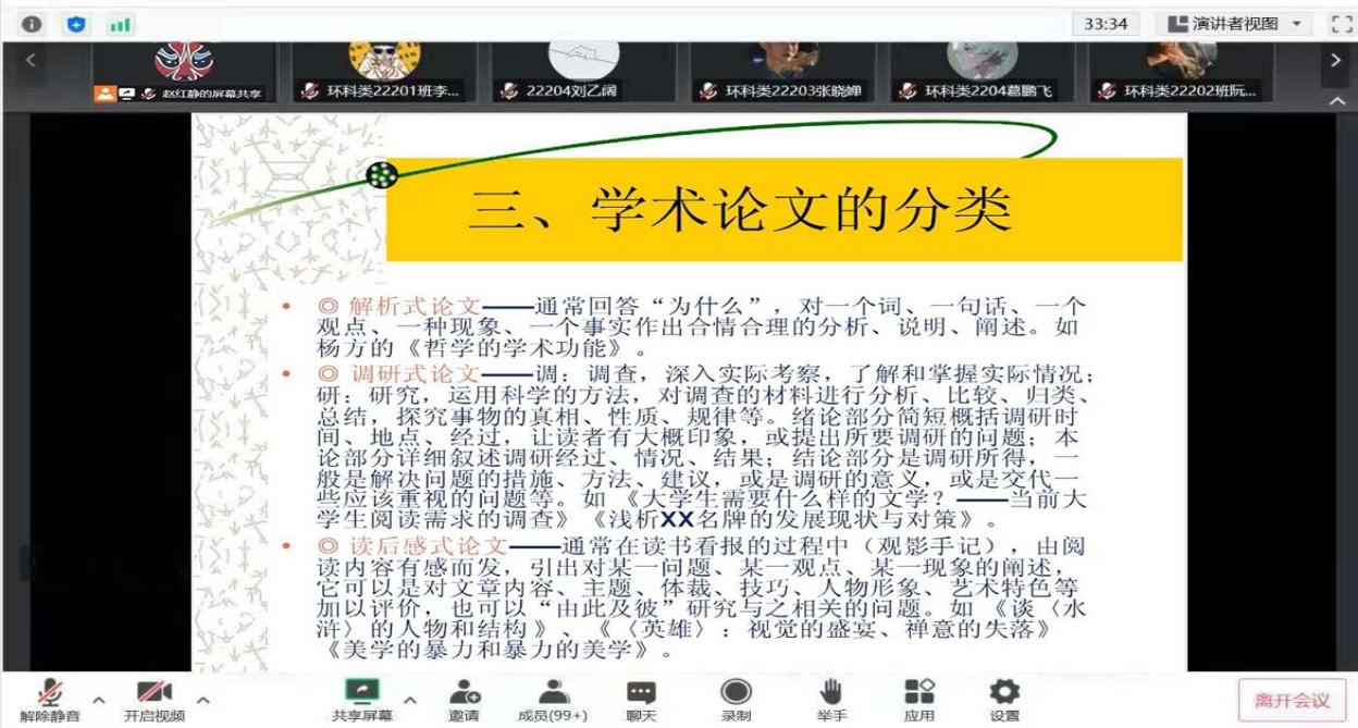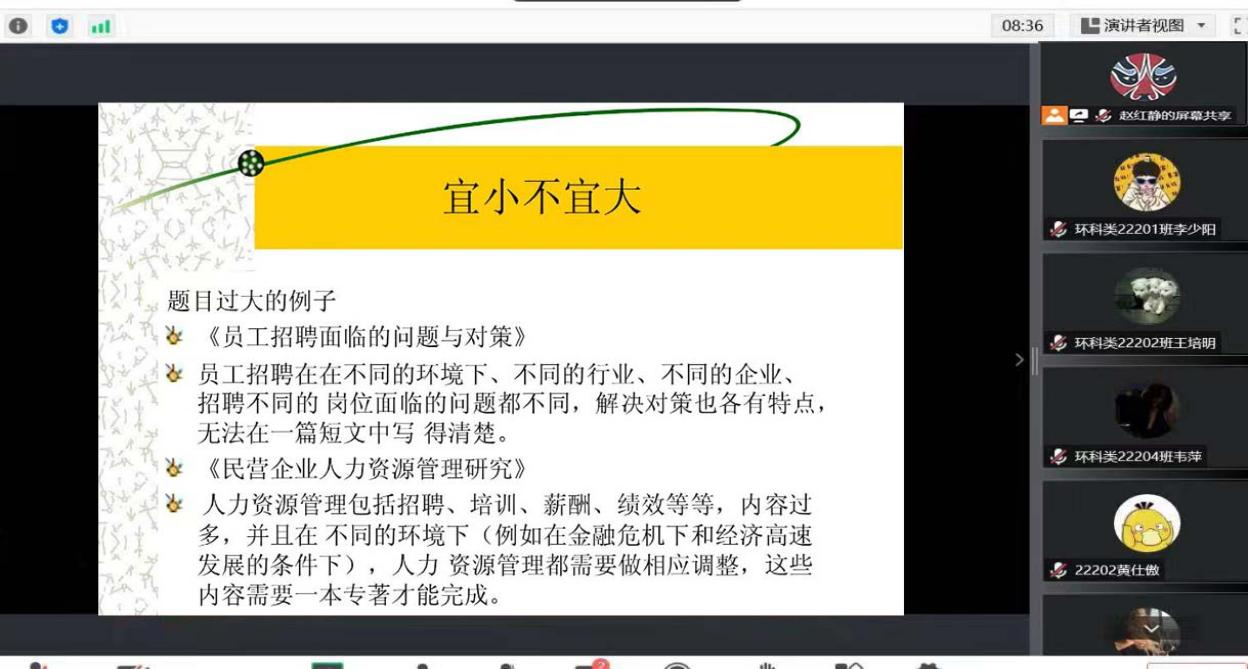 (通讯员 杨照辉 图/文 )为培养同学们的学术思维和专业素养,整体提高同学们的实践撰写水平,将来更好地完成学业和就业,304am永利集团于2022年10月20日下午19时整在腾讯会议,邀请到赵红静老师为同学们带来了一场题为“论文指导促成长”的精彩讲座。党委副书记范梅英老师出席本次讲座,全体大一同学和部分大二大三同学参与其中。