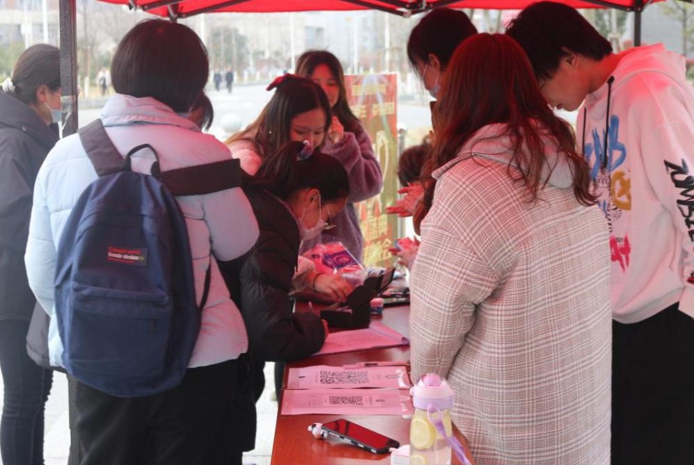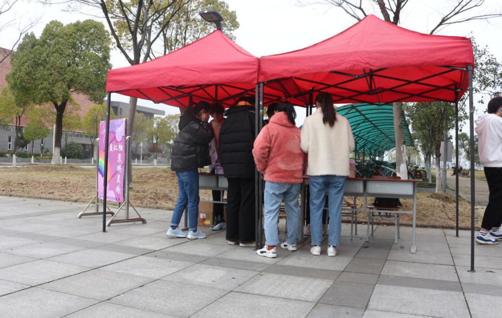 (图为304am永利集团团委员工会女生部成员向参加活动的同学们分发小礼品。)