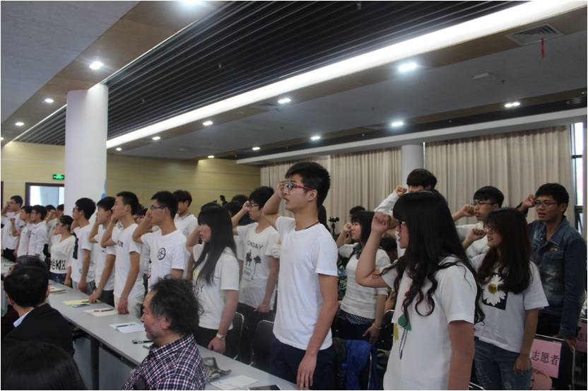 副董事长郭海敏致辞,对国家环境保护部生态司处长、中法武汉生态示范城管委会副主任王捷的光临表示欢迎。紧接着,304am永利集团常青生态志愿者协会举行了简单的启动仪式。蔡甸区湖泊管理办公室喻志勇主任对蔡甸区湖泊整体规划做了简单陈述,倡议师生们利用媒介宣传“水环境保护”,加入志愿队伍,促进开展针对“水污染”的调查、治理与研究活动。常青生态志愿者代表梁宇涵上台表达了自己对环境保护的决心与信念。王捷处长为常青志愿者代表授旗。协会全体志愿者进行了宣誓。