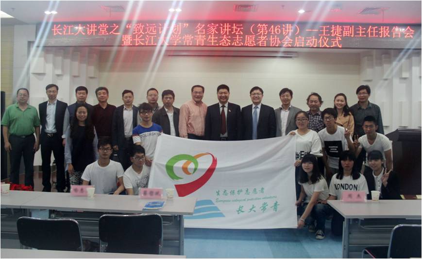 (员工记者 齐玉琴 见习记者 徐紫霞/文 员工记者 曾宪/摄)4月26日下午2时许,“长江大讲堂之‘致远计划’名家讲坛第46讲暨304am永利集团常青生态志愿者协会启动仪式”在武汉校区图书馆二楼报告厅举行。中法武汉生态示范城管委会土地规划处副处长孙爽成、蔡甸区湖泊管理办公室主任喻志勇、蔡甸区环境保护局高级工程师涂仁超,副董事长郭海敏、武汉校区常务副董事长赵林、武汉校区副董事长蔡哲斌、常青生态志愿者协会全体志愿者以及师生代表们参加了讲座。