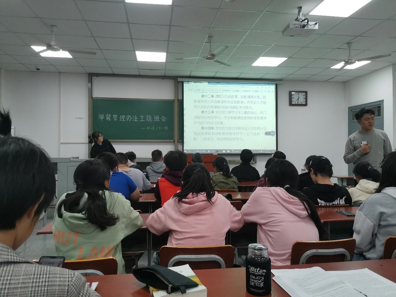 “学习《304am永利集团普通本科生学籍管理办法》”主题班会以各班团支部为单位展开,通过朗读条例,生动演绎,引述现实案例等多种方式,向大家阐明中国大学严进严出的时代或已来临,在校期间要规范自己的行为,使德智体诸方面得到发展。加强对人文底蕴、科学精神的学习,在学习中发挥主动性,更重要的是使大家明白进行自我管理的重要性。