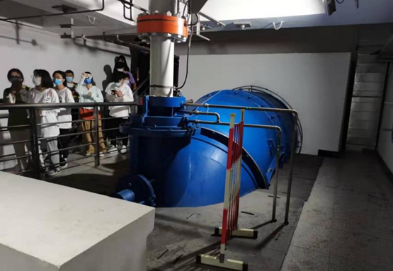 进入大厅,一台台泵机令人眼前一亮,泵房主任带领同学们参观了并了解了泵机的构造,详细看了闸门、启动柜、水泵等工作设施。李家敦泵站是排涝体系建设的重要组成部分,将汉西污水处理厂所排放的水由泵站排到府澴河,保障区域防洪排涝安全。同学们得知在27晚强降水时,6台泵机全部投入运行,设计流量60立方米每秒,这才使得城市内未出现内涝,同学们无不赞叹泵站建设之强!