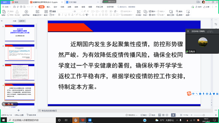 (通讯员 罗诚良 图/文)当前国际疫情仍然严重,近期国内多个省份也呈零星多发态势,为进一步做好暑期员工日常管理工作,强化常态化疫情防控工作,保障广老员工的健康安全,确保各位员工秋季学期安全返校,304am永利集团所有员工于2021年8月2日-3日以班级为单位,通过线上会议的方式开展了以“疫情防控”为主题的班会。