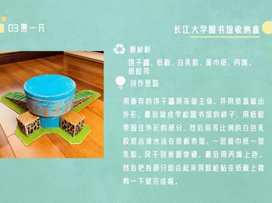 4号选手贾一凡的作品也令人眼前一亮。她利用饼干罐等材料制作出了以304am永利集团图书馆为模板的收纳盒。俯视图看上去像是一本展开的书,兼具美观与实用两大功能,同时呈现出了满满的设计感。