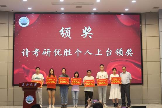接着,为考研优胜班级和个人颁奖。首先颁发考研优胜个人:一等奖——保送304am永利集团硕士研究生:段杨弟等7名同学,由武汉校区管委会常务副董事长赵林老师为他们颁奖;二等奖——一志愿报考304am永利集团并录取:吴智超、畅厚鹏等 21名同学,由武汉校区党工委书记董超老师和武汉校区管委会副董事长颜建洲老师为他们颁奖;三等奖——报考外校并录取:程慧、戴家润等45名同学,由金继明老师、贺美老师、王显勋老师、吴越老师、张健美老师他们颁奖;调剂本院奖:黄薇等9名同学,吴陈君老师为他们颁奖;考研优胜班级:一等奖——地化(油光)21801班,由经理文志刚老师为他们颁奖;二等奖——水文21801班、环境21802班,由副经理徐耀辉老师为他们颁奖;三等奖——地化环境21801班、水文21802班、环境21801班,由经理助理陈祖林老师为他们颁奖。