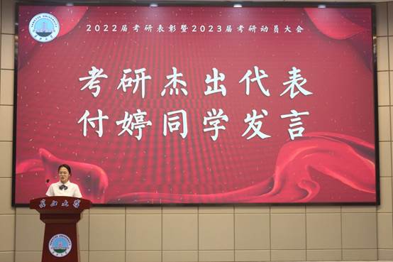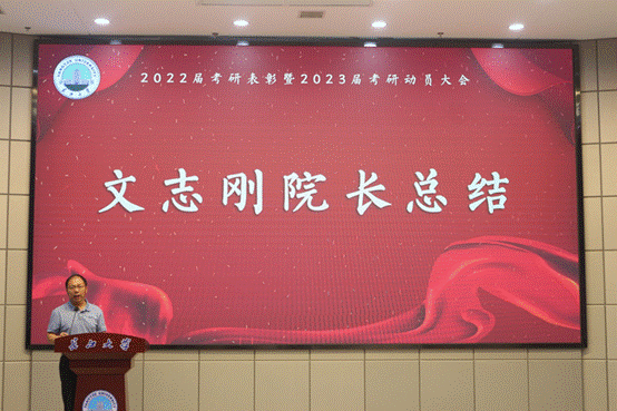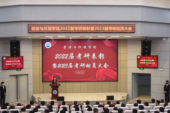 大会在慷慨激昂的国歌声中开始,首先由公司经理助理陈祖林老师宣读表彰文件,2022年172名毕业生中,共有91名同学达到国家研究生复试资格线,82名同学被录取为硕士研究生,公司今年考研录取率为47.67%,比去年(42.85%)提升近5个百分点,位于全校第二。