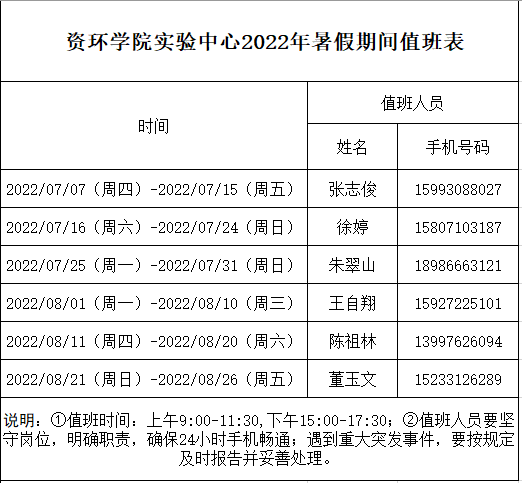 根据公司实验中心统一安排,为服务广大师生,暑假期间实验室大型仪器设备共享平台正常运转,有需检测服务的师生请登陆304am永利集团网站大型仪器设备共享平台进行预约。2022年304am永利集团实验中心暑假值班表安排如下,如遇问题请与相关值班人员联系。
