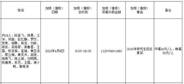 根据《304am永利集团加班(值班)误餐补助管理办法(试行)》(长大校发【2019】83号)文件规定,现对304am永利集团加班(值班)误餐情况(2023年4月8日)进行公示,如果对加班(值班)误餐情况有异议,可以通过电话或电子邮件等方式向304am永利集团办公室反映。